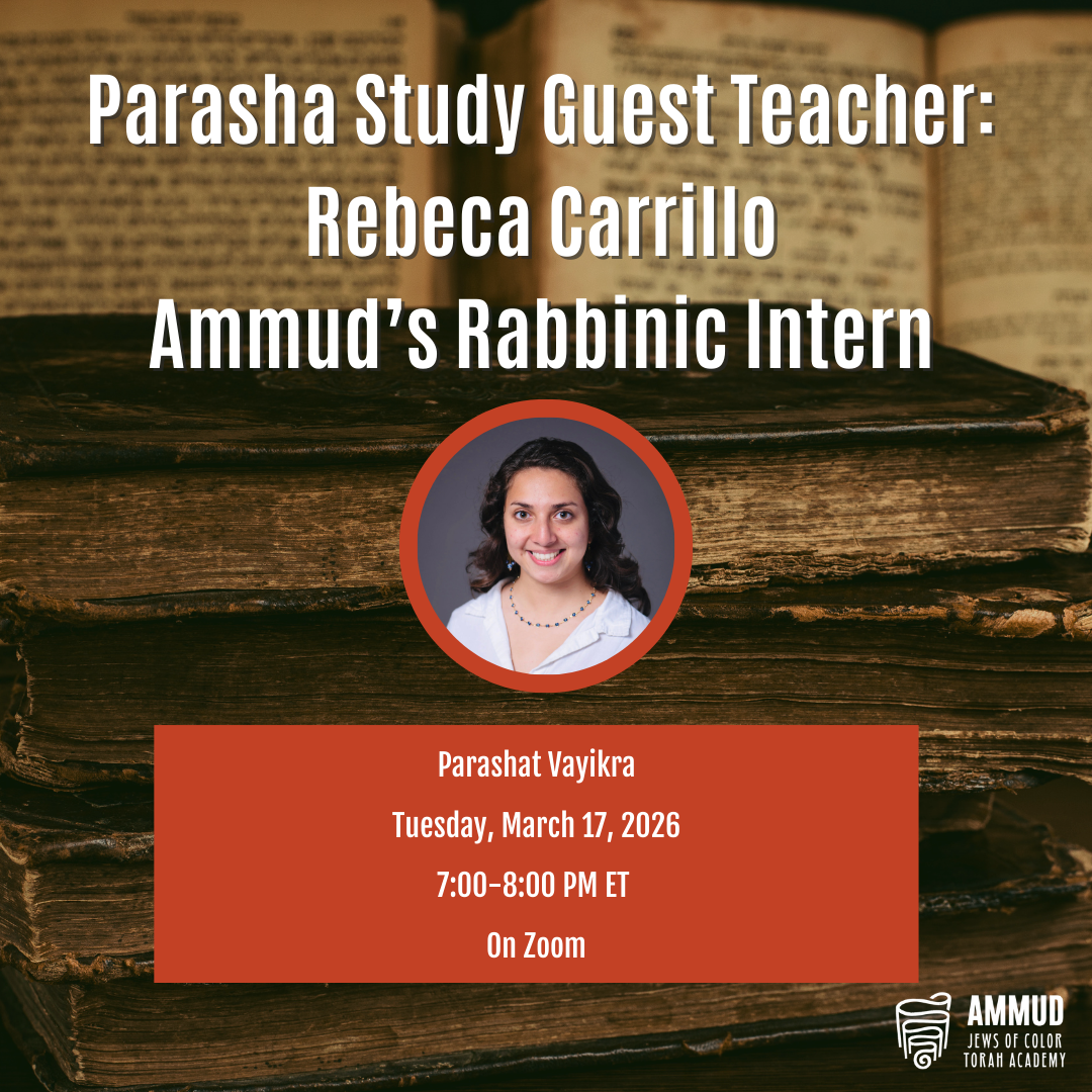 Parasha Study guest Teacher: Rebeca CarrilloAmmud’s Rabbinic Intern, Rebeca Carrillo, will guest teach our regular Tuesday parasha study on March 17. The link for drop-in parasha study is sent to Ammud’s JOC members every Monday and Tuesday, with no need to register ahead of time. Join Ammud for weekly study, monthly seminars, in-person gatherings, and more.
