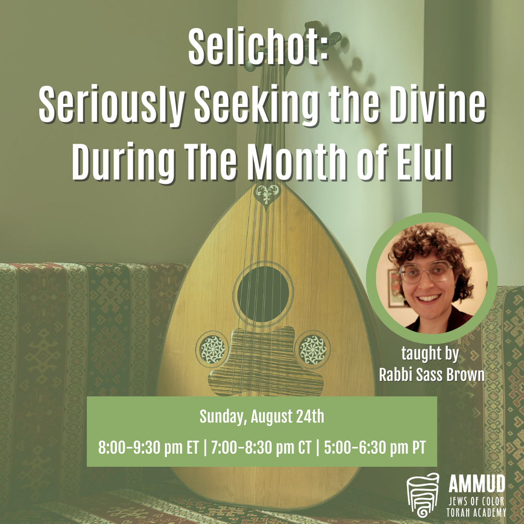 Come start Elul, the month of return, by studying the poetic words of the Selichot service. Rabbi Sass will teach about the history and customs of Selichot, highlighting the different practices among Ashkenazi and Sefardi-Mizrachi communities. We'll study some of Selichot's inspirational texts, and then conclude by listening to some traditional Selichot music, with time for reflective writing.
